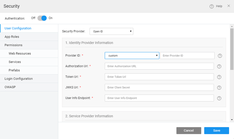 WaveMaker allows you to authenticate your apps with OpenID. Setting the Security Provider to OpenID will allow you to configure a Service Provider of your choice. This involves the following details: