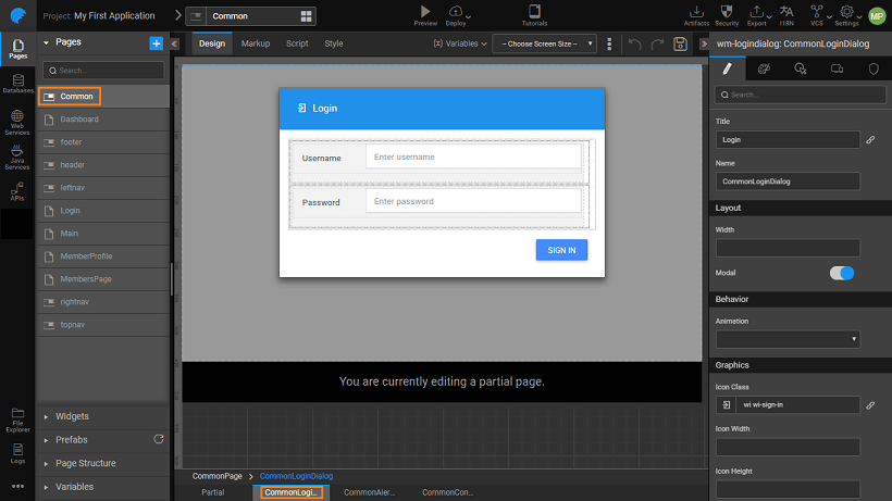 - or using a login dialog pop-up provided by Studio. This dialog is present in the Common page as "CommonLoginDialog" and can be customized.