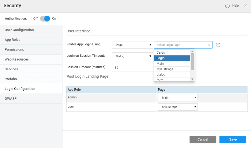 - How the Login should be handled: using a login page - you can use the default login page provided by Studio or create your own page;
