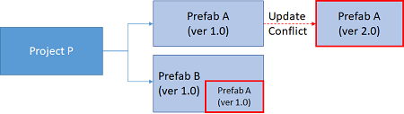 - Project P is using Prefab A ver 1.0 and Prefab B which internally uses Prefab A (ver 1.0).