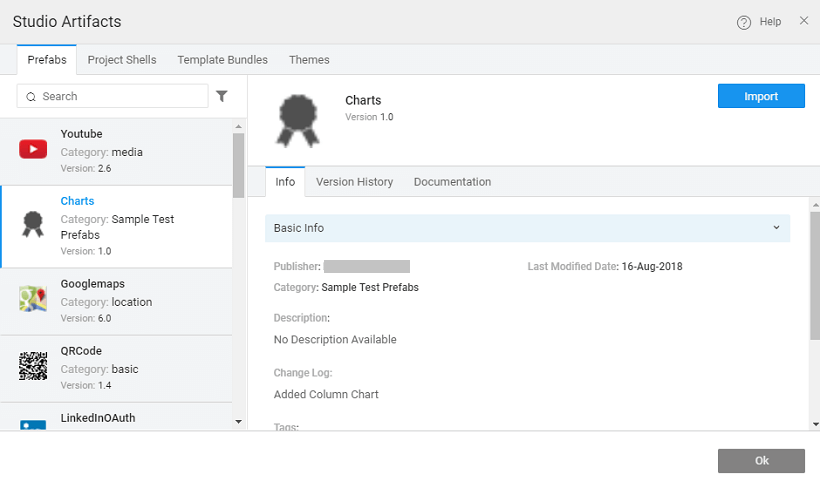 Once approved, these Prefabs will be available for Import from the Artifacts List. IMP: To use the Prefab in a project, the developer must Import the prefab into the project from the artifact repository and refresh the Prefab panel.