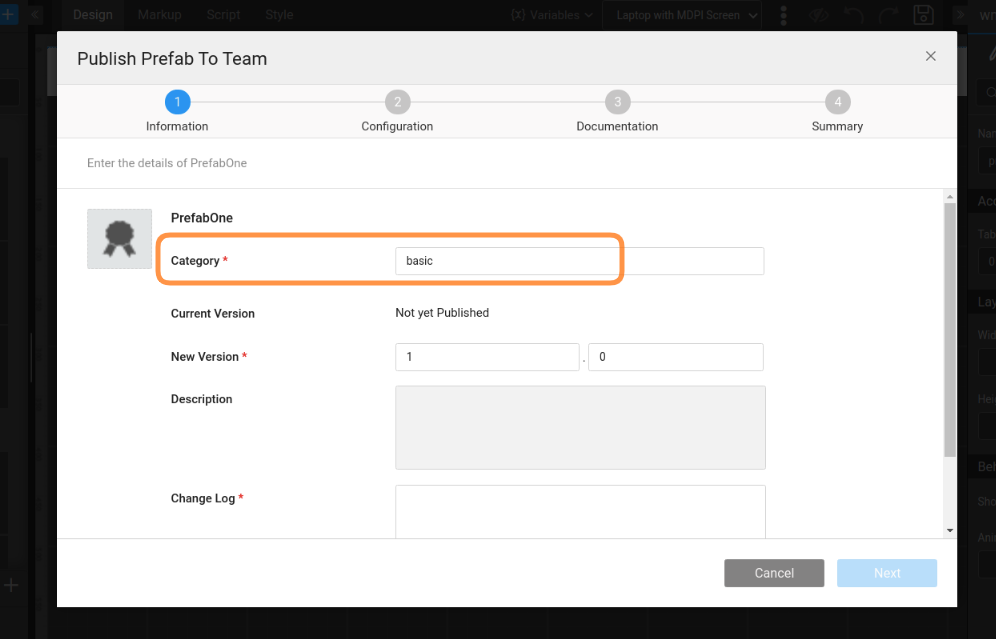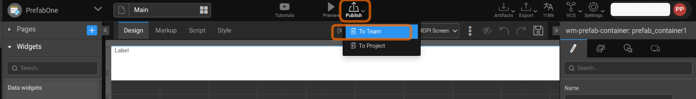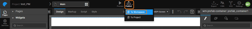 Using the Publish to Workspace option from the Main Menu listed under the app name, you can make your Prefab available across all projects within your workspace. Once Published the Prefab will be displayed in the Prefab section of the Widgets Panel under the category specified at the time of publishing.