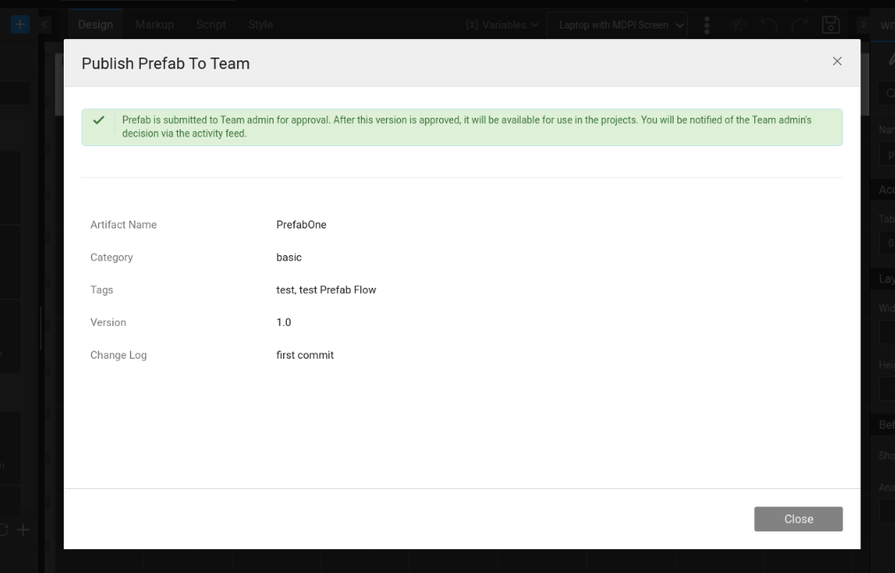 Once the prefab is published, it needs to be approved by the Team Admin from Team Portal.