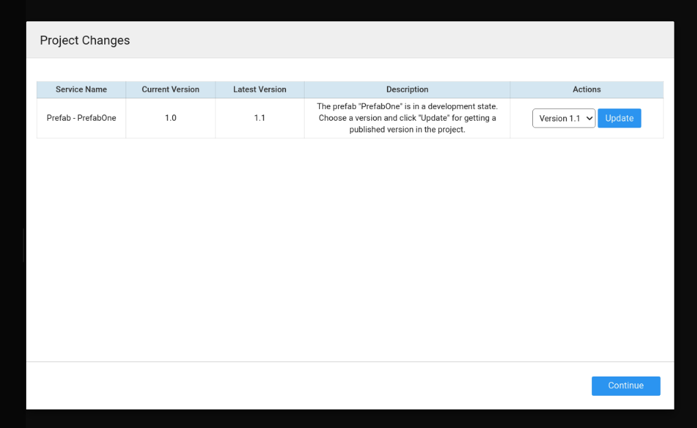 Updated Prefabs: By updating the Prefab version while publishing the Prefab will update the version and the latest version will be available across all the projects. When a project using this Prefab is opened, the developer will be prompted to update the same within the project. When you open a project using the Prefab (i.e the Prefab was dragged and dropped onto the canvas) you will see a dialog asking you to update the Prefab You can choose to update or continue with the previous version. In case you choose to continue with the previous version, whenever you try to drag and drop the Prefab, you will be prompted to update the same.