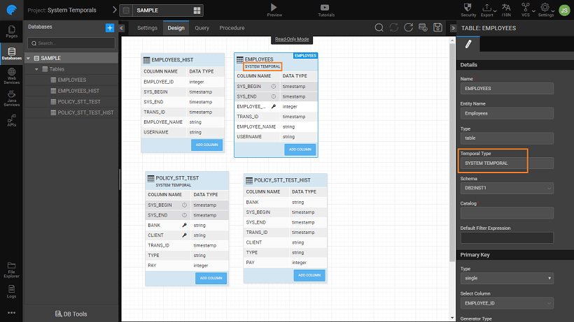 In addition to the standard APIs generated for the imported databases, the tables with temporals will have an additional period APIs auto-generated. This can be used to access the temporal data.