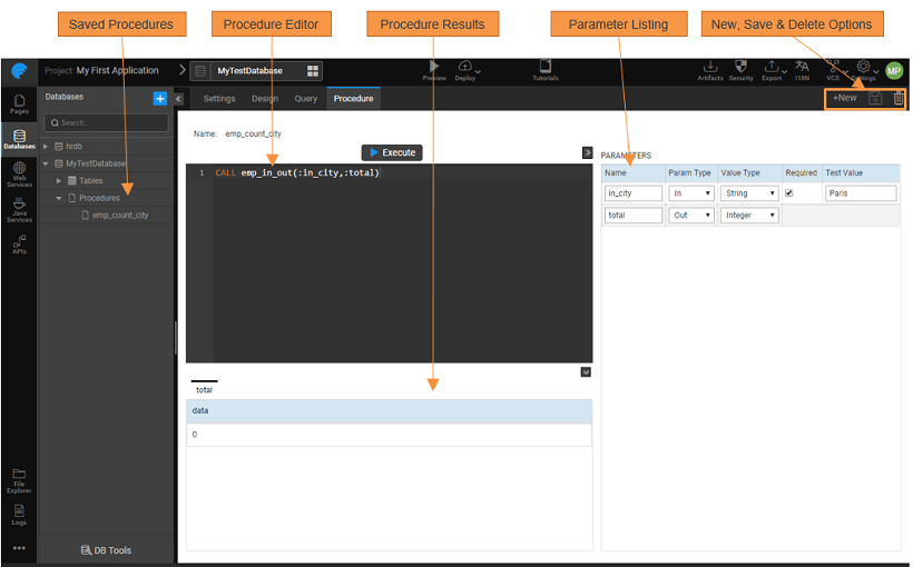 WaveMaker supports the execution of procedures/functions written using PL/SQL. You can find out more about Stored Procedures here. In this section, we will be seeing how WaveMaker supports Stored Procedures with the help of an example. We are using a MySQL database.