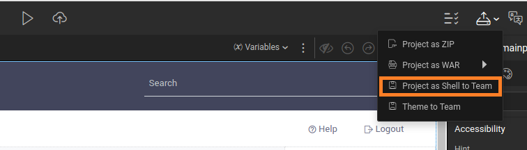 • Team version: Once the developer exports a project as Shell to Team, they will be prompted to enter the publishing information, see Artifact features for more information. The Team Admin has to approve or reject the Shell as with any other Artifact. Once approved, developers can select the Shell when creating new projects.