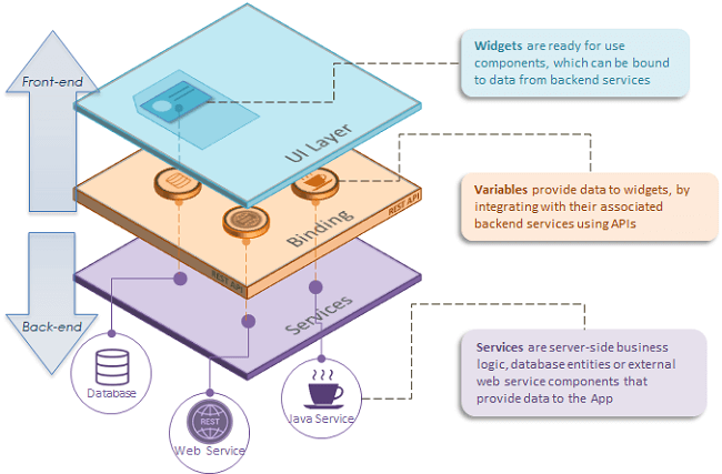 App building process combines the ability to develop front-end by auto-generating widget code and binding to the data services. From the data model obtained from the database, back-end services with their REST API contracts are auto-generated for integration. Both the front-end and back-end layers can be integrated with the help of binding and variables, which enable data integration with various services such as DB, Web Services or any custom Java Service.