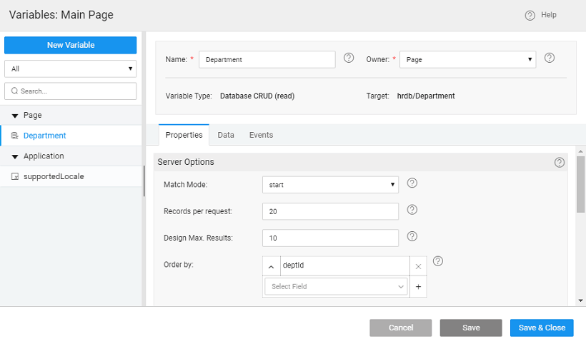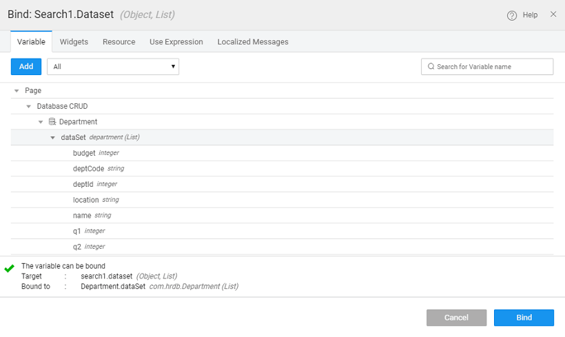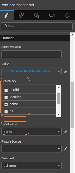 3. Bind the Value dataset property of the search widget to the department variable created in the previuos step.