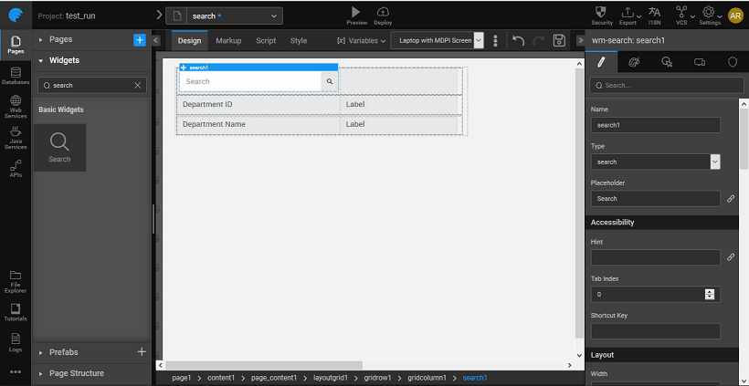 WaveMaker allows you to add search capability via the search widget. Following are the steps in using the same. We will use the search widget to search the Department database from the sample HRDB imported earlier and display the department id and name.