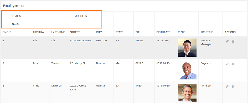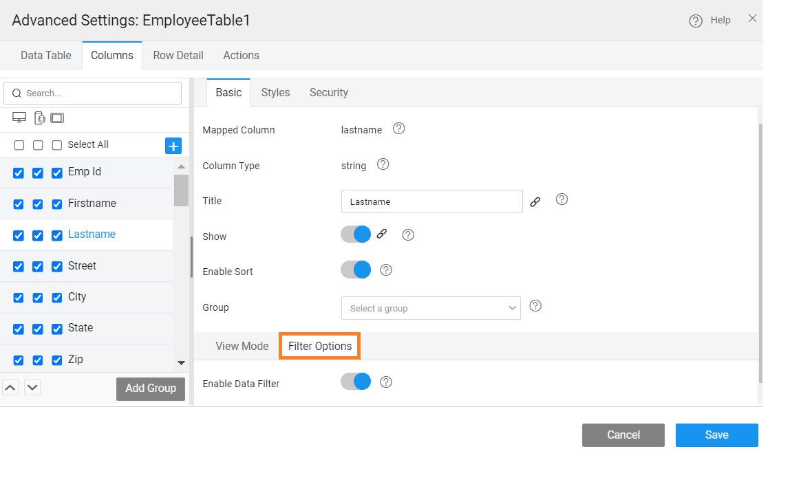 Format Options enables you to define the display format of the column at runtime. The options include toDate, toCurrency, prefix, suffix, and srtingtoNumber. Be aware that these format types selected are only for display purpose. During runtime, edit row will display the values as defined in the data source.
