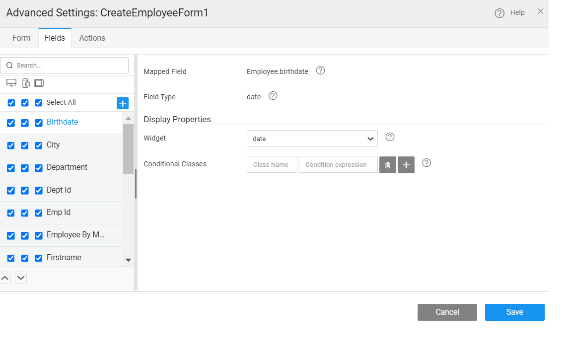 1. specify the widget to be used to represent each data field. Based on the data type of the field, the available widget options would vary.