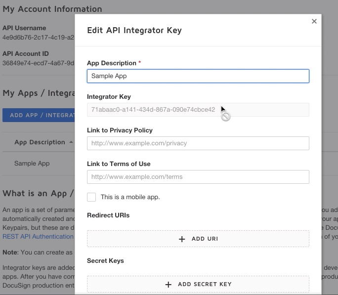 4. Integrator Key: Provide the Integrator Key derived for your Docusign App from the Docusign Admin console.