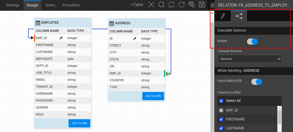 • Step-2: Enable the Cascade Option for the one-to-many relation as shown in the image below. For more information, see Working with Database Schema.