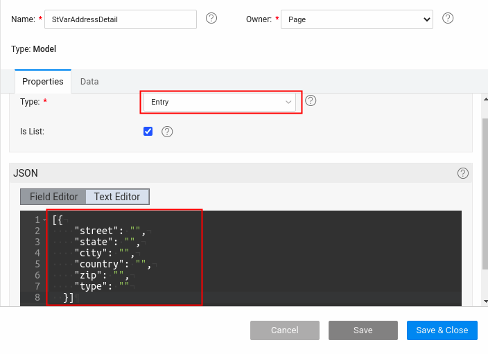 • Step-4: Create a model variable with Entry type and set the flag to the isList option and also the metadata same as the child entity(Address Entity present in the database) as shown in the image below.