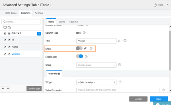 - Open the Advanced Settings of the Data Table widget and uncheck the Show property for the version column.