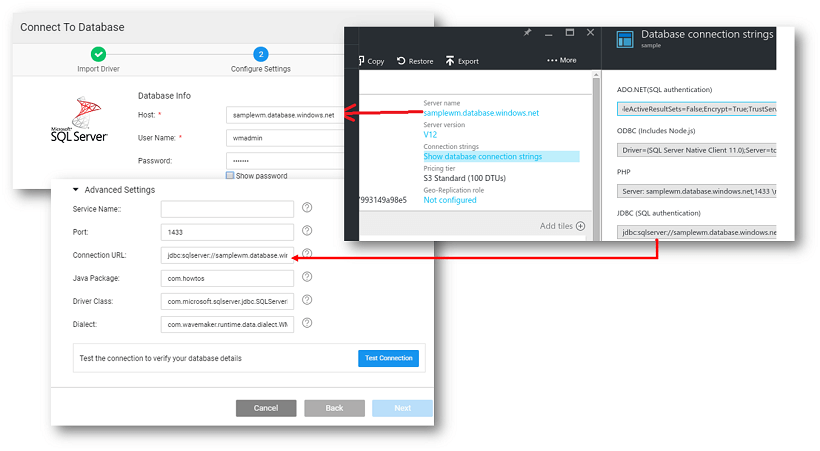 4. Provide Azure SQL server details such as Host, User Name, Password and Database Name, Schema Filter (comma-separated list of schema names to import) in the configure settings step and click on ADVANCED SETTINGS button to review the generated connection url. Note: The mappings between the Azure MS SQL Server and WaveMaker are given in the next section.