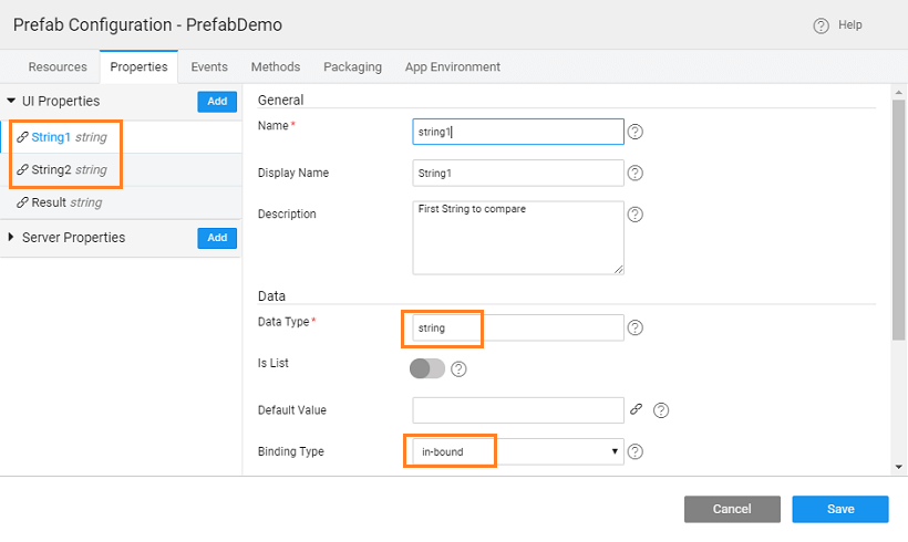 • In the Properties tab, add two inbound properties which will take in the two strings to compare and one outbound property to return the result