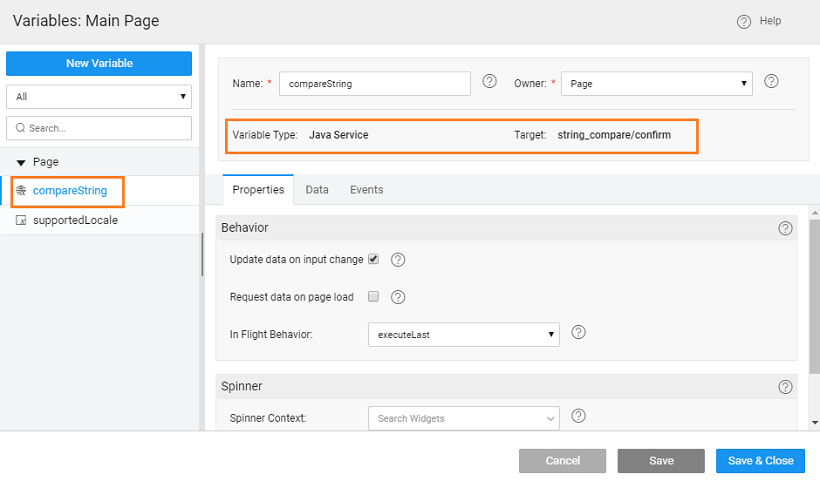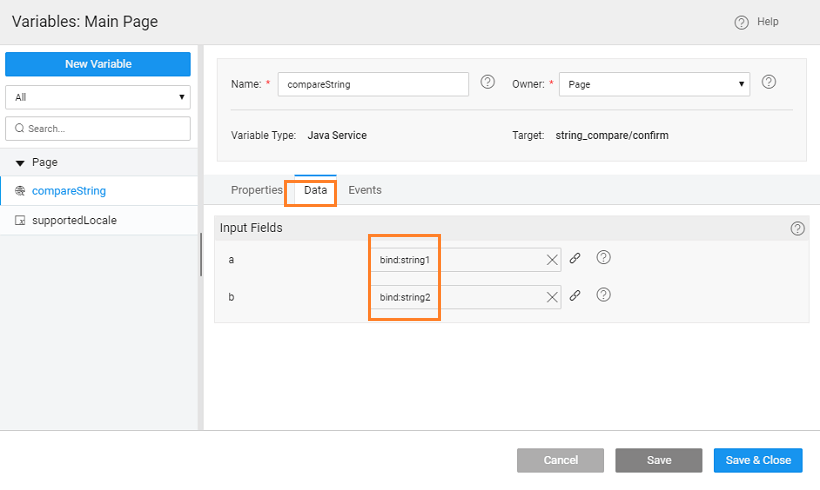1. Create a Variable to invoke the Java Service (string_compare) and method (confirm) within that service.