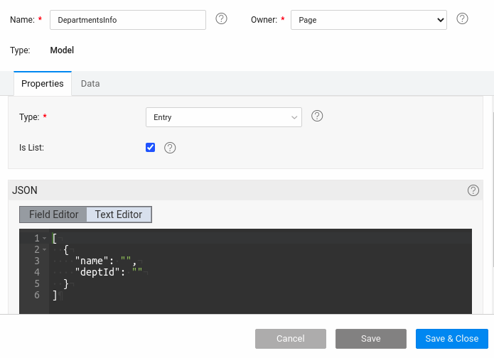 • Set the Content property of the Tab Pane to the Partial page created in Step-2 by binding the deptId to Variables.DepartmentsInfo.dataSet[$i].deptId.