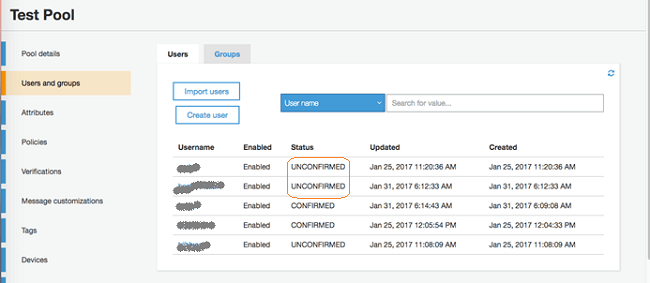 - After creating the account, Login page shows up. Verification of the user should be done by going to to the Amazon Cognito Create User Pool page and click on Users and Groups in the Left Navigation Pane. This will show you the all the Users added to the user pool.