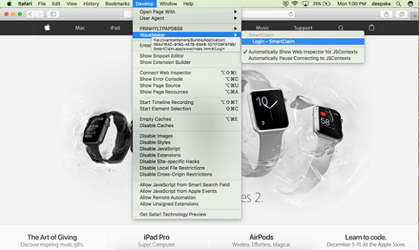 • Open Safari in a MacBook, and click on ‘Develop’ menu.