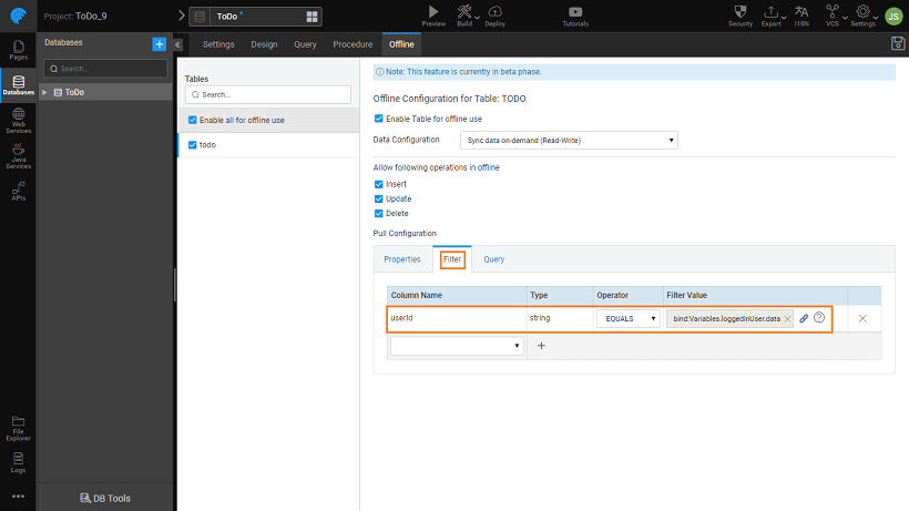 3. Make TODO table to be available in offline. Pull only tasks belongs to the logged-in user during app startup. Save the configuration.
