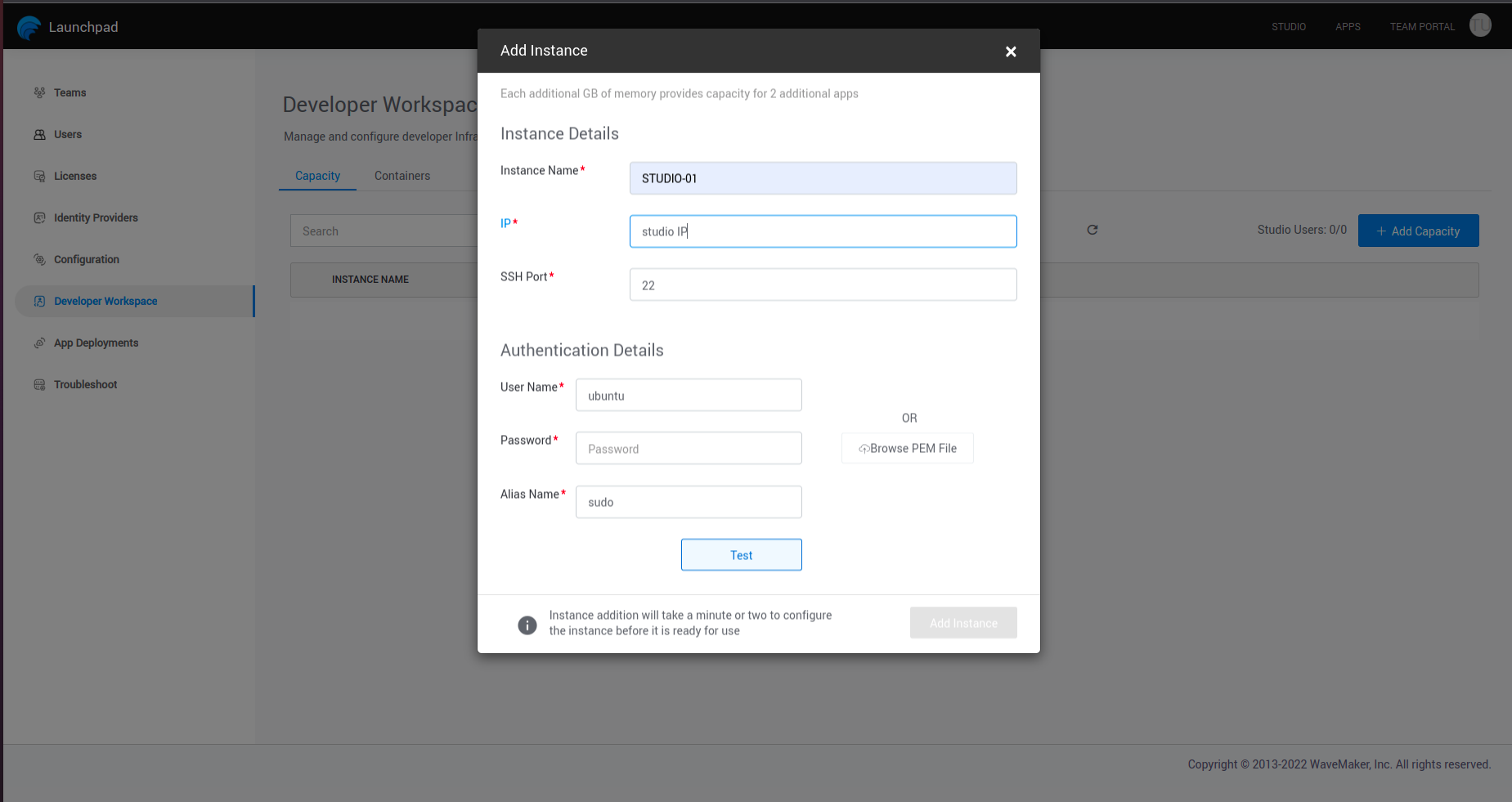 • During workspace instances configuration process WaveMaker running commands with sudo , if user using any another name or command for sudo, user need to add that as alias in ~/.bash_aliases file and also need to provide that alias name during studio workspace/app deploy capicity adding at launchpad.