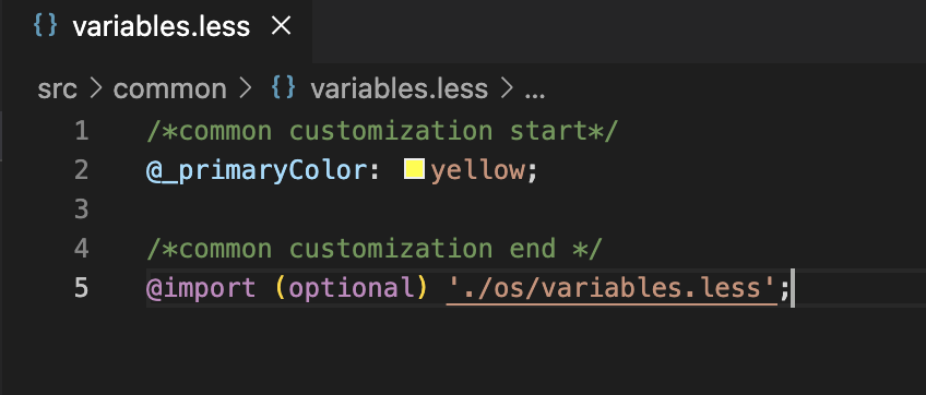 • Open src/common/variables.less. For a platform-specific change, open corresponding variables.less of that platform folder.